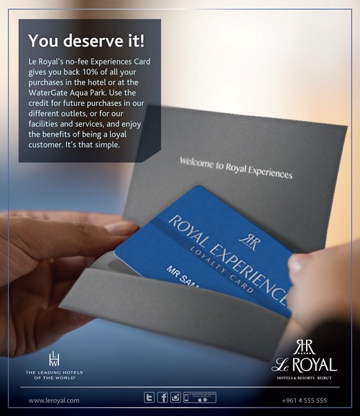 Welcome to Le Royal Hotel - Beirut's Loyalty program. As a client of Le Royal Hotels you are automatically entitled our Loyalty Card which gives you a discount all over the property. With this card you will automatically get credit equivalent to 10% of all your purchases in the hotel, on rooms, restaurants,spa and WaterGate .